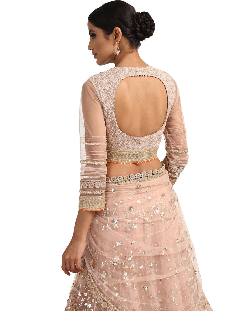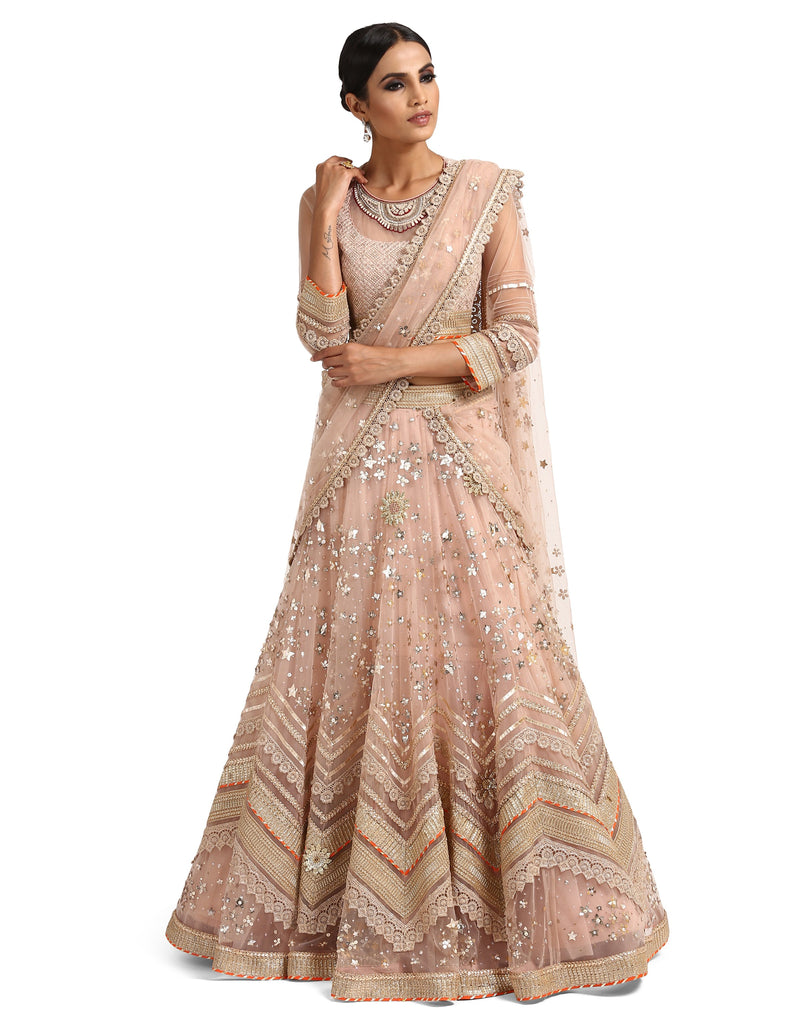 A unique marriage of the saree and lehenga comes to life in this ensemble. Adorned with gota applique work and zari star embroidery, the skirt and drape exude charisma. Continue the look with an embroidered blouse.