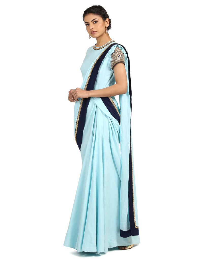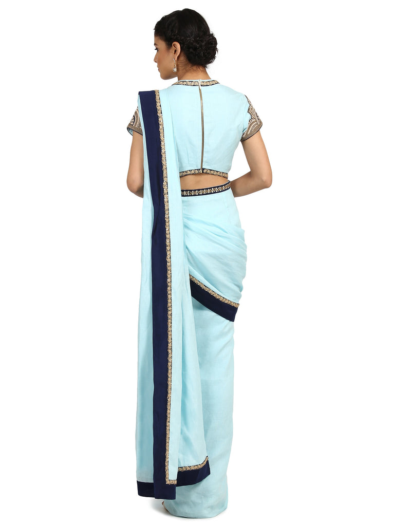 Fusing the traditional saree with the contemporary gown, this ensemble features a pre-attached drape. Zardozi embroidery embellishes the sleeves and the neckline. Finished off with back zipper detail.