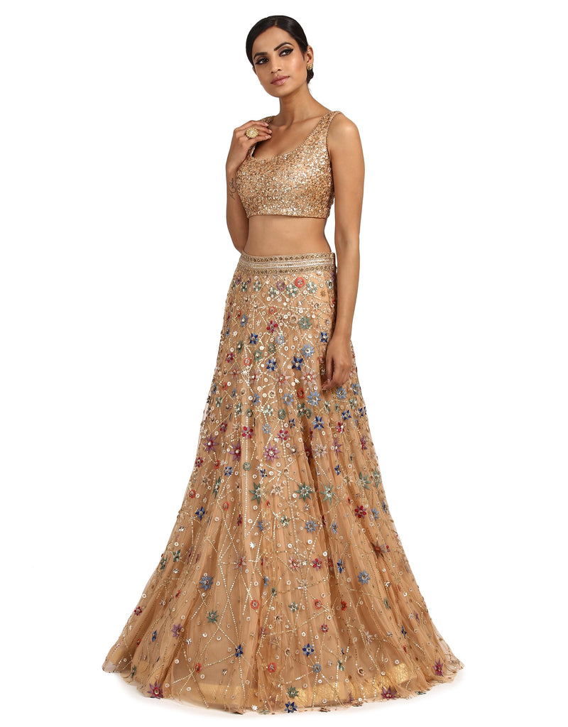 Hand-embellished resham embroidery seamlessly blends with gold sequin work in this lush lehenga. Exuding grandeur and charisma, it is complemented by a gold sequin blouse with a cutout back.