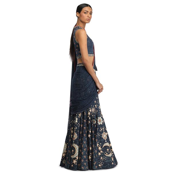Two classic silhouettes merge to create an innovative ensemble featuring a lehenga with a pre-draped georgette saree. Features graceful astral projections and a dressed up waistline.